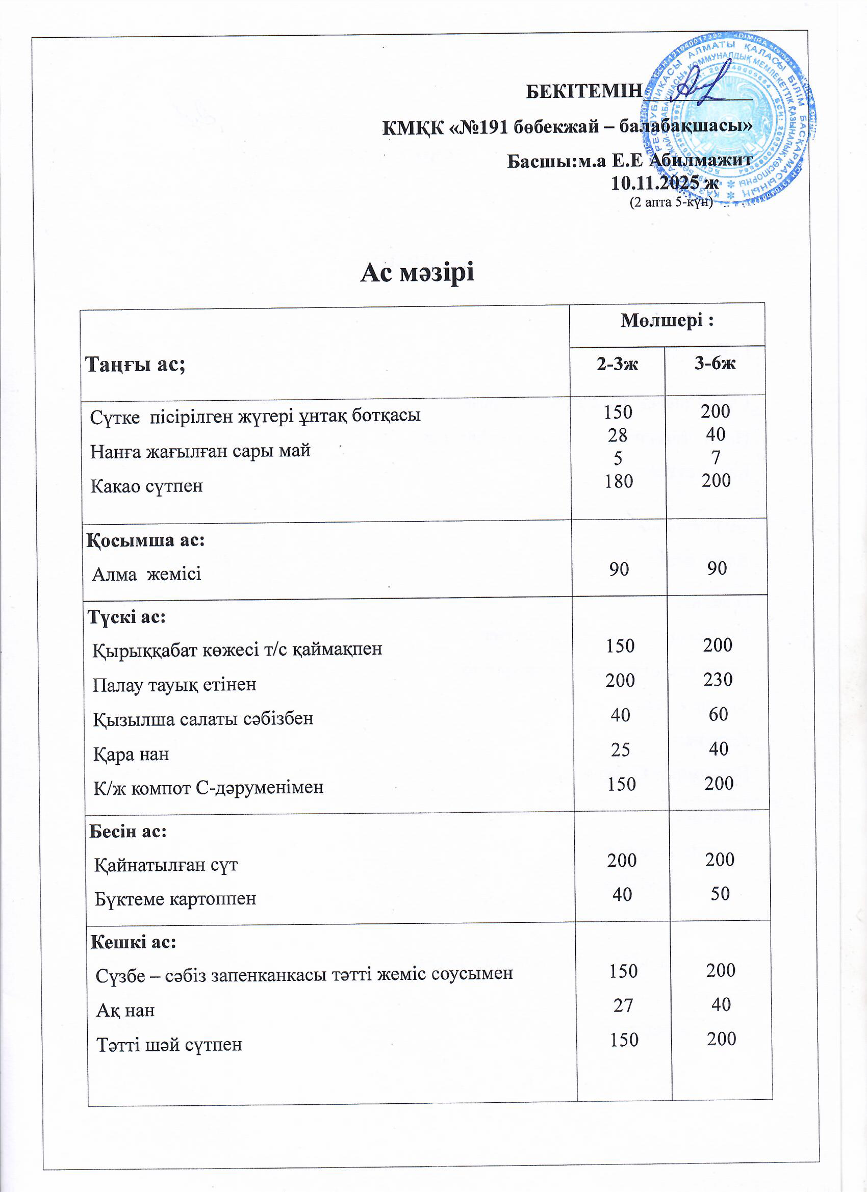 Ас мәзірі » №191 «бөбекжай-балабақшасы