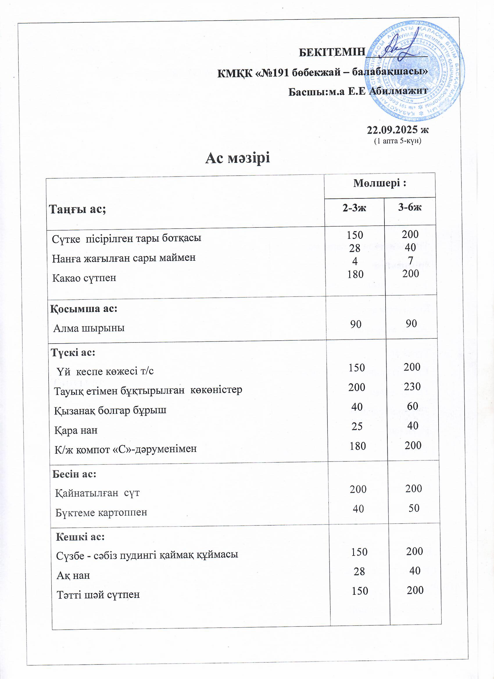 Ас мәзірі » №191 «бөбекжай-балабақшасы