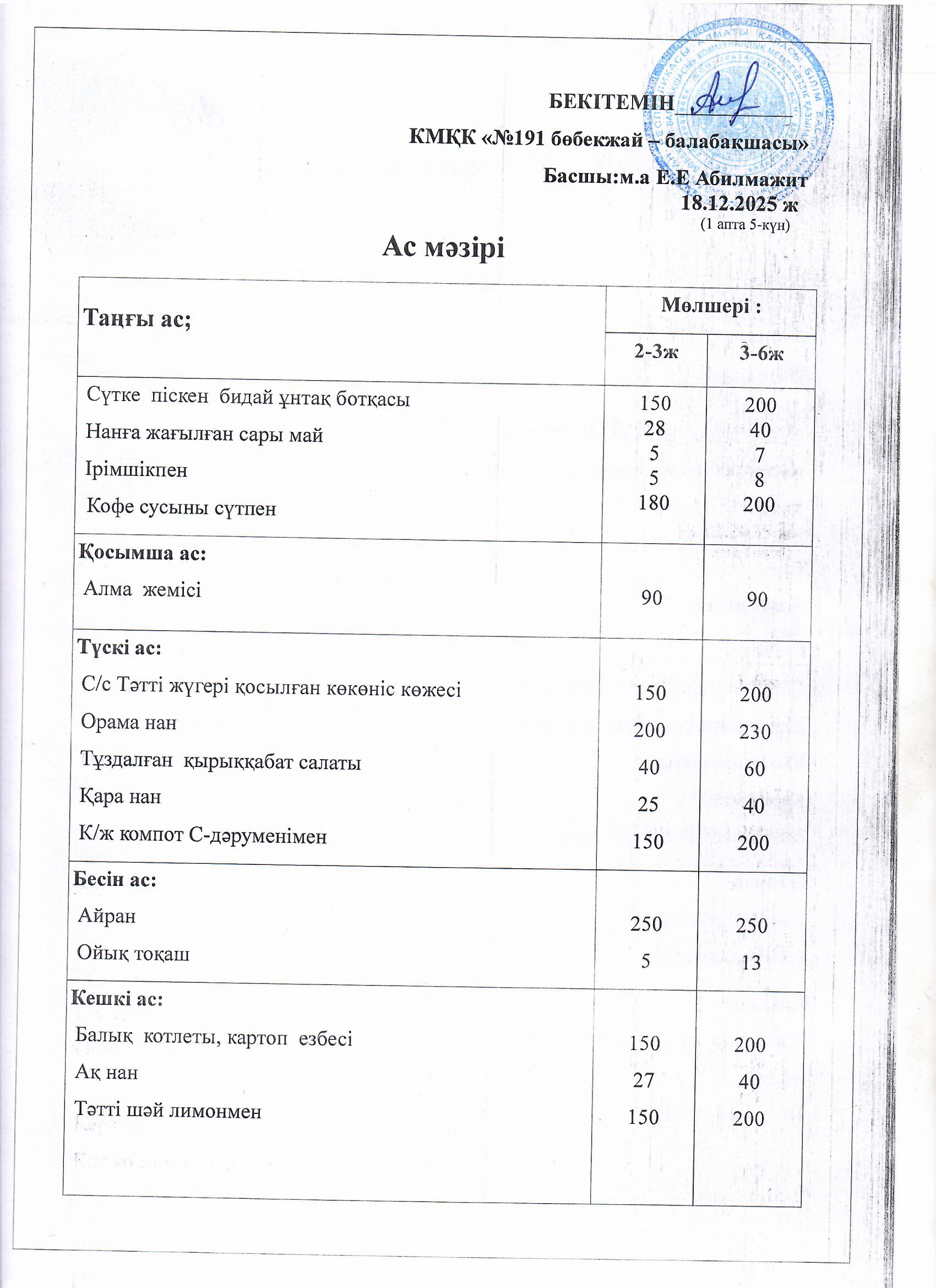 Ас мәзірі » №191 «бөбекжай-балабақшасы